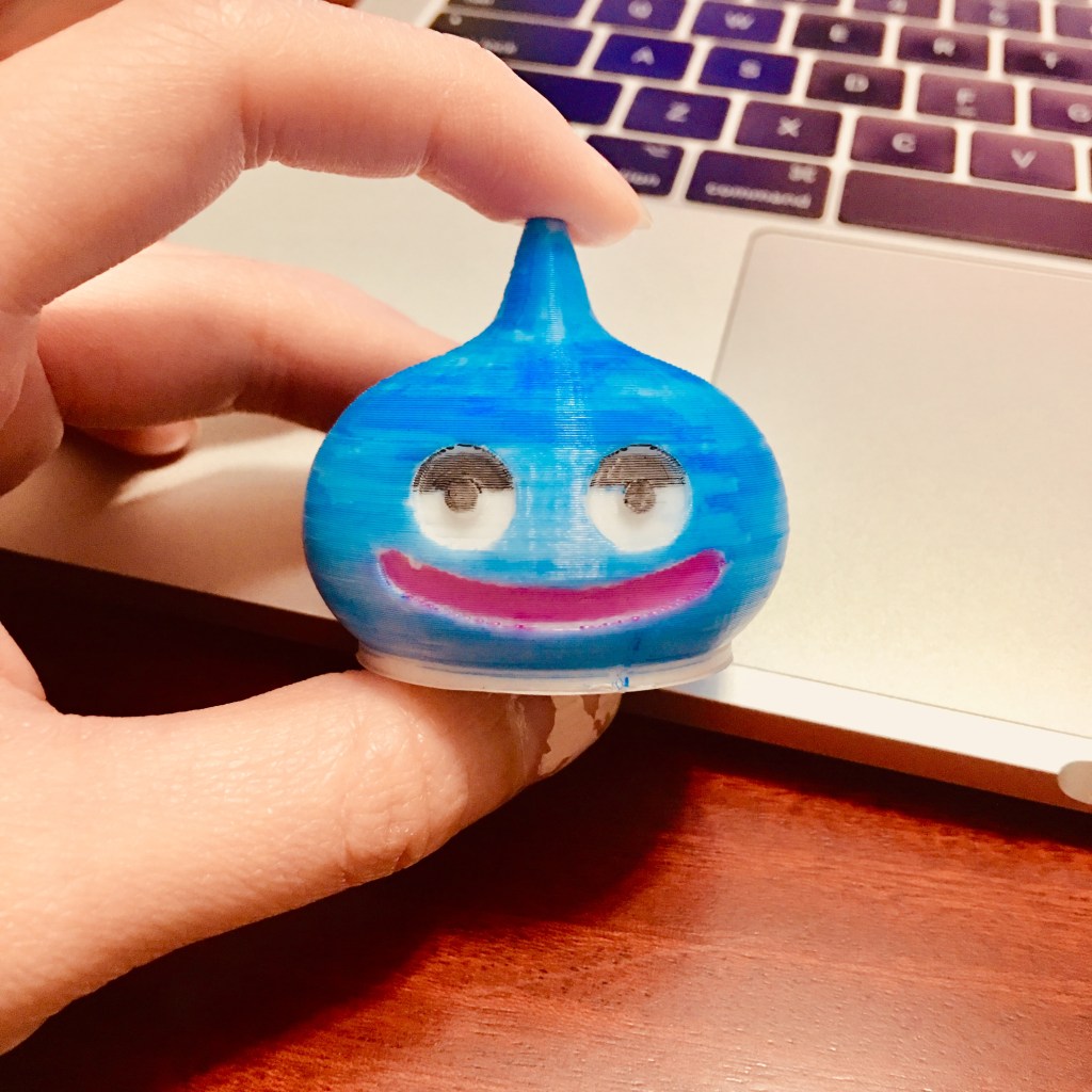 This is a generic slime character from the video game franchise, Dragon Quest. His name is Rocket Slime, and I loved his design from the series. When it came to 3d printing, I was first inspired by bulbous, stackable characters such as Disney’s Tsum Tsums or those stackable stuffed animals. This slime is stackable with other duplicates of it since it has a hole at the bottom. There were drawn parallels to me that if something was small and plastic, it should be a simplistic character which could be holdable. This design easily rests in my palm. I found other slime models and stackable characters on Thingiverse, but none spoke out to me as almost identical. Painting was the most difficult. I did not have any acrylics, but I found out permanent markers went great on any surface including pcl. Also I added eyelids to this character, because I found the muppet-like eyes to be more endearing than the original slime.