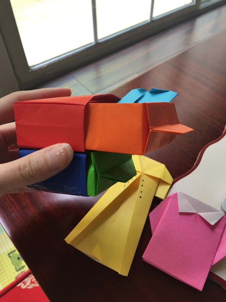 It’s origami. I had a really fun time, making each little piece, from the drawers to the trousers. Of course, the trousers and drawers combo was the center piece for this side quest. And the pants do fit perfectly into the sliding drawers.