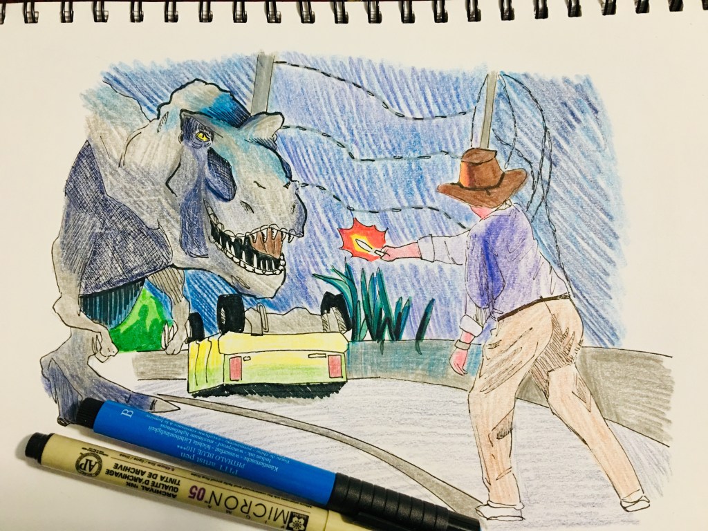 I decided to recreate my favorite scene from Jurassic Park. The drawing and inking was really fun, but coloring was the toughest. I almost regret putting color down since it looks really rough, but I will keep practicing my coloring skills. Hope you enjoy my illustration!